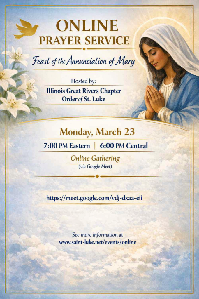 The Order of St. Luke hosts monthly online liturgies near minor feast days so that we can worship regularly as a whole order. Contact Chaplain General Kimberly Greway (kgreway at stjohnsnorthversailles.com) if you or your chapter would like to volunteer to lead one of the liturgies.